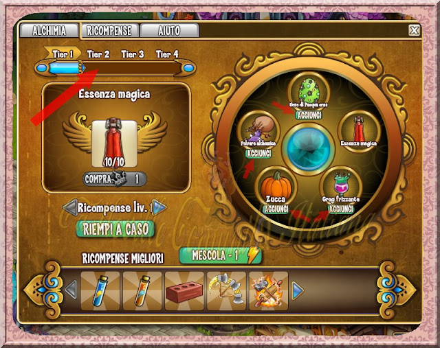 sulla scheda "Alchimia" dovrete selezionare dove indica la freccia il numero del livello delle ricompense e poi cliccare su aggiungi per i materiali da mescolare